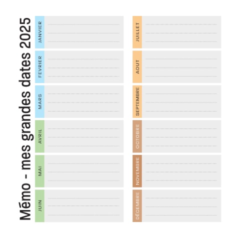 Mémo - mes grandes dates 2025 JANVIER JUILLET FEVRIER AOUT MARS SEPTEMBRE AVRIL OCTOBRE MAI NOVEMBRE DÉCEMBRE JUIN