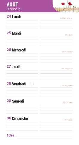 AOÛT Semaine 35 24 Lundi St Barthélemy 25 Mardi St Louis 26 Mercredi Ste Natacha 27 Jeudi Ste Monique 28 Vendredi St Augustin 29 Samedi Ste Sabine 30 Dimanche St Fiacre Notes :