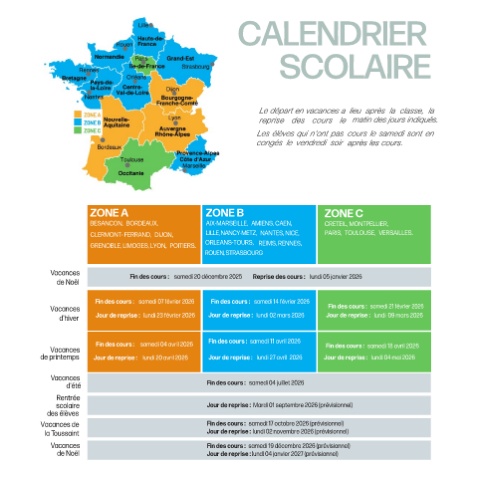 Vacances Fin des cours : samedi 20 décembre 2025 Reprise des cours : lundi 05 janvier 2026 du sam. 28 février au lundi 16 mars 2026 Été fin des cours samedi 04 juillet 2026