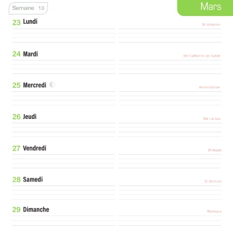 Mars Semaine 13 23 Lundi St Victorien 24 Mardi Ste Catherine de Suède 25 Mercredi Annonciation 26 Jeudi Ste Larissa 27 Vendredi St Habib 28 Samedi St Gontran 29 Dimanche Rameaux