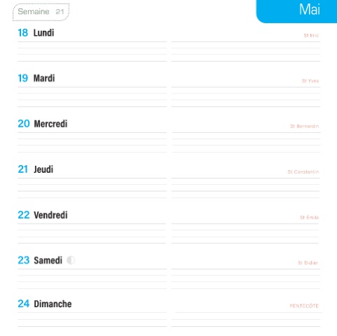 Mai Semaine 21 18 Lundi St Eric 19 Mardi St Yves 20 Mercredi St Bernardin 21 Jeudi St Constantin 22 Vendredi St Émile 23 Samedi St Didier 24 Dimanche PENTECÔTE