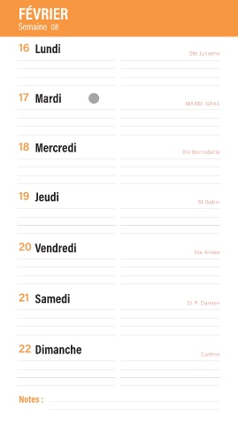 FÉVRIER Semaine 08 16 Lundi Ste Julienne 17 Mardi MARDI GRAS 18 Mercredi Ste Bernadette 19 Jeudi St Gabin 20 Vendredi Ste Aimée 21 Samedi St P. Damien 22 Dimanche Carême Notes :