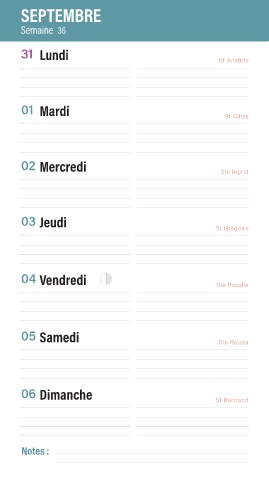 SEPTEMBRE Semaine 36 31 Lundi St Aristide 01 Mardi St Gilles 02 Mercredi Ste Ingrid 03 Jeudi St Grégoire 04 Vendredi Ste Rosalie 05 Samedi Ste Raïssa 06 Dimanche St Bertrand Notes :