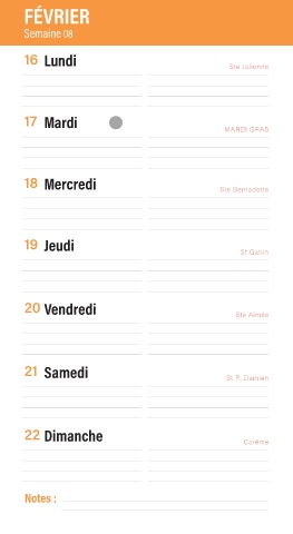 FÉVRIER Semaine 08 16 Lundi Ste Julienne 17 Mardi MARDI GRAS 18 Mercredi Ste Bernadette 19 Jeudi St Gabin 20 Vendredi Ste Aimée 21 Samedi St P. Damien 22 Dimanche Carême Notes :