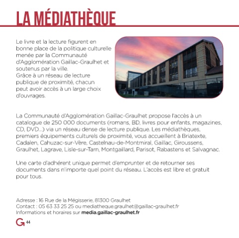 Contact : 05 63 33 25 25 ou mediatheque.graulhet@gaillac-graulhet.fr