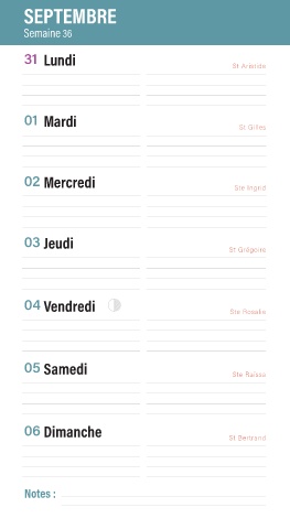 SEPTEMBRE Semaine 36 31 Lundi St Aristide 01 Mardi St Gilles 02 Mercredi Ste Ingrid 03 Jeudi St Grégoire 04 Vendredi Ste Rosalie 05 Samedi Ste Raïssa 06 Dimanche St Bertrand Notes :