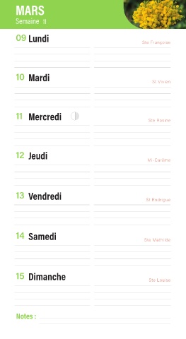 MARS Semaine 11 09 Lundi Ste Françoise 10 Mardi St Vivien 11 Mercredi Ste Rosine 12 Jeudi Mi-Carême 13 Vendredi St Rodrigue 14 Samedi Ste Mathilde 15 Dimanche Ste Louise Notes :