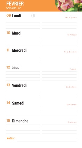 FÉVRIER Semaine 07 09 Lundi Ste Appoline 10 Mardi St Arnaud 11 Mercredi N.-D. Lourdes 12 Jeudi St Félix 13 Vendredi Ste Béatrice 14 Samedi St Valentin 15 Dimanche St Claude Notes :
