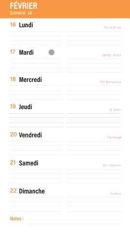 FÉVRIER Semaine 08 16 Lundi Ste Julienne 17 Mardi MARDI GRAS 18 Mercredi Ste Bernadette 19 Jeudi St Gabin 20 Vendredi Ste Aimée 21 Samedi St P. Damien 22 Dimanche Carême Notes :