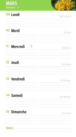 MARS Semaine 11 09 Lundi Ste Françoise 10 Mardi St Vivien 11 Mercredi Ste Rosine 12 Jeudi Mi-Carême 13 Vendredi St Rodrigue 14 Samedi Ste Mathilde 15 Dimanche Ste Louise Notes :