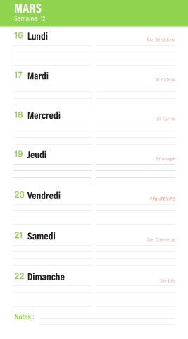 MARS Semaine 12 16 Lundi Ste Bénédicte 17 Mardi St Patrice 18 Mercredi St Cyrille 19 Jeudi St Joseph 20 Vendredi PRINTEMPS 21 Samedi Ste Clémence 22 Dimanche Ste Léa Notes :