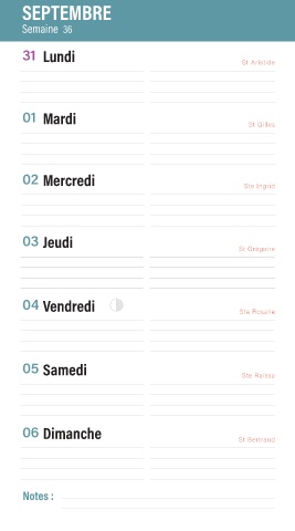 SEPTEMBRE Semaine 36 31 Lundi St Aristide 01 Mardi St Gilles 02 Mercredi Ste Ingrid 03 Jeudi St Grégoire 04 Vendredi Ste Rosalie 05 Samedi Ste Raïssa 06 Dimanche St Bertrand Notes :